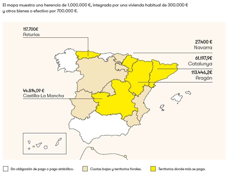 El tercer supuesto, con una herencia de 1.000.000 euros, comunidades como Andalucía, Baleares, Cantabria y Galicia siguen eximiendo del pago, y Canarias apenas exige una cantidad simbólica. “En el extremo opuesto, territorios como Navarra, Castilla-La Mancha, Catalunya, Aragón y Asturias imponen pagos que pueden superar los 100.000 euros, siendo Aragón y Asturias los más gravosos”, señala González.
